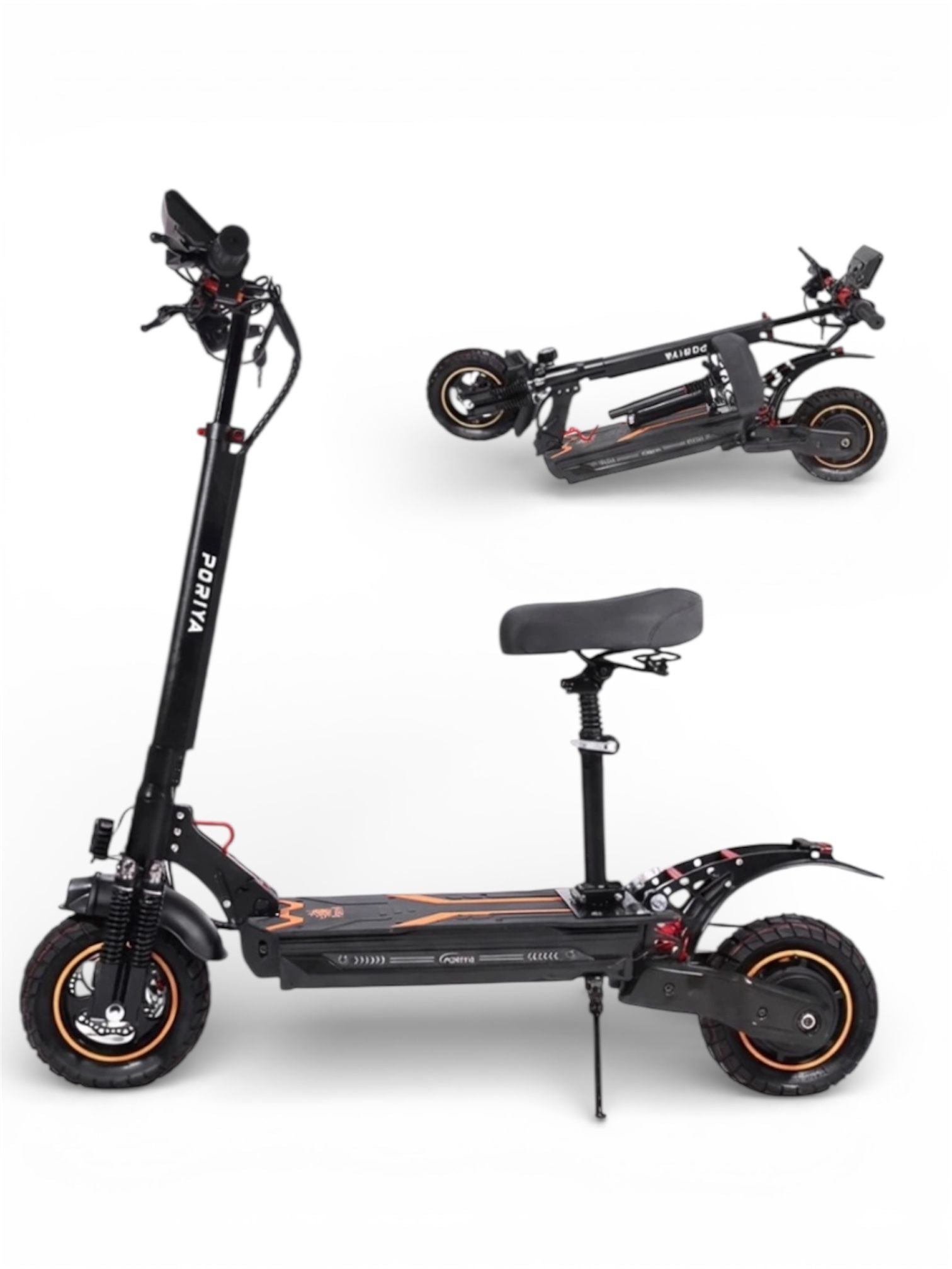 Built with premium aluminum alloy construction for durability and lightweight portability. The foldable design makes it easy to carry and store. Supports riders up to 150 kg with reinforced deck and frame. Weighs just 28 kg, making it one of the most portable high-power scooters available.